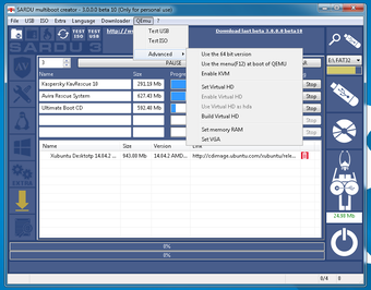 Una vez grabados los sistemas operativos y herramientas en el soporte elegido, SARDU permite probar el arranque a través del emulador QEMU, así como añadir carpetas personales o ítems personalizados en el menú de arranque.
